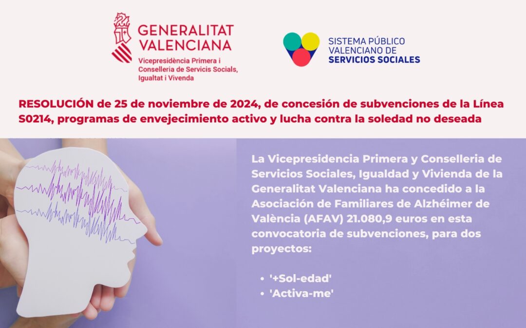 La Vicepresidencia Primera y Conselleria de Servicios Sociales, Igualdad y Vivienda de la Generalitat Valenciana ha concedido a la Asociación de Familiares de Alzhéimer de València (AFAV) ayudas por 21.080,90 euros para los programas ‘+Sol-edad’ y ‘Activa-me’.